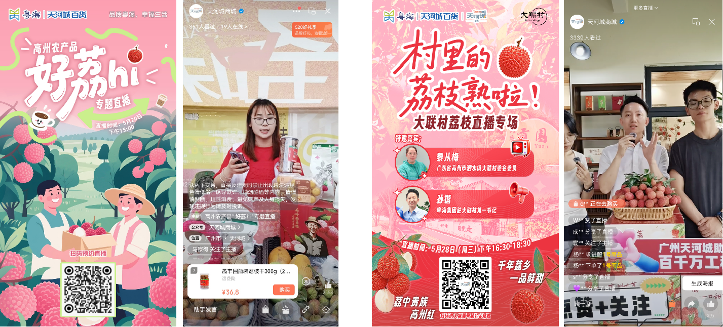 5月,粤海天河城组织天河城商业、万亚公司、深圳天河城开展“村里的荔枝熟啦”“古树荔香浓”等荔枝主题直播,累计吸引了线上近10万观众观看,助力线上线下高州荔枝销售额超70万元,有力地推动了高州荔枝产业的发展。