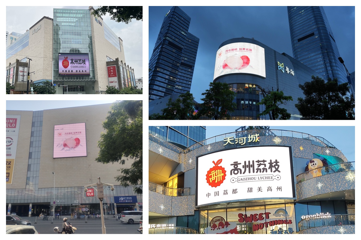 以荔为媒,甜蜜表白,高州荔枝宣传片、宣传海报登陆广州、深圳、天津等国内一线城市核心商圈的天河城购物中心以及广州多个标志性商圈的22面大屏,展播一个月,每天可触达上百万人次,诚邀粤港澳大湾区乃至全国的市民朋友们共享活动盛事和传承千年的甜蜜佳果。